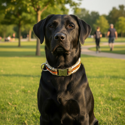 Arlo – Handgefertigtes Paracord Hundehalsband mit Gravur | Orange-Braun-Weiß-Beige