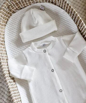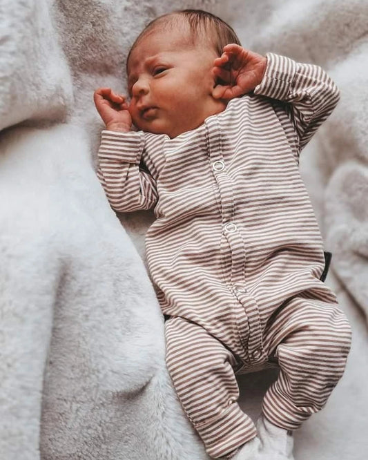 AYLAN Set Strampler mit Mütze in weiß mit braunen Streifen 2-Tlg. - Handmade