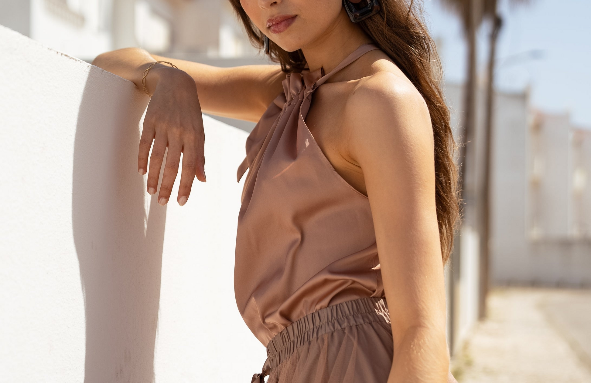 ELISABETH Satin-Top mit Schleife am Kragen in mokka