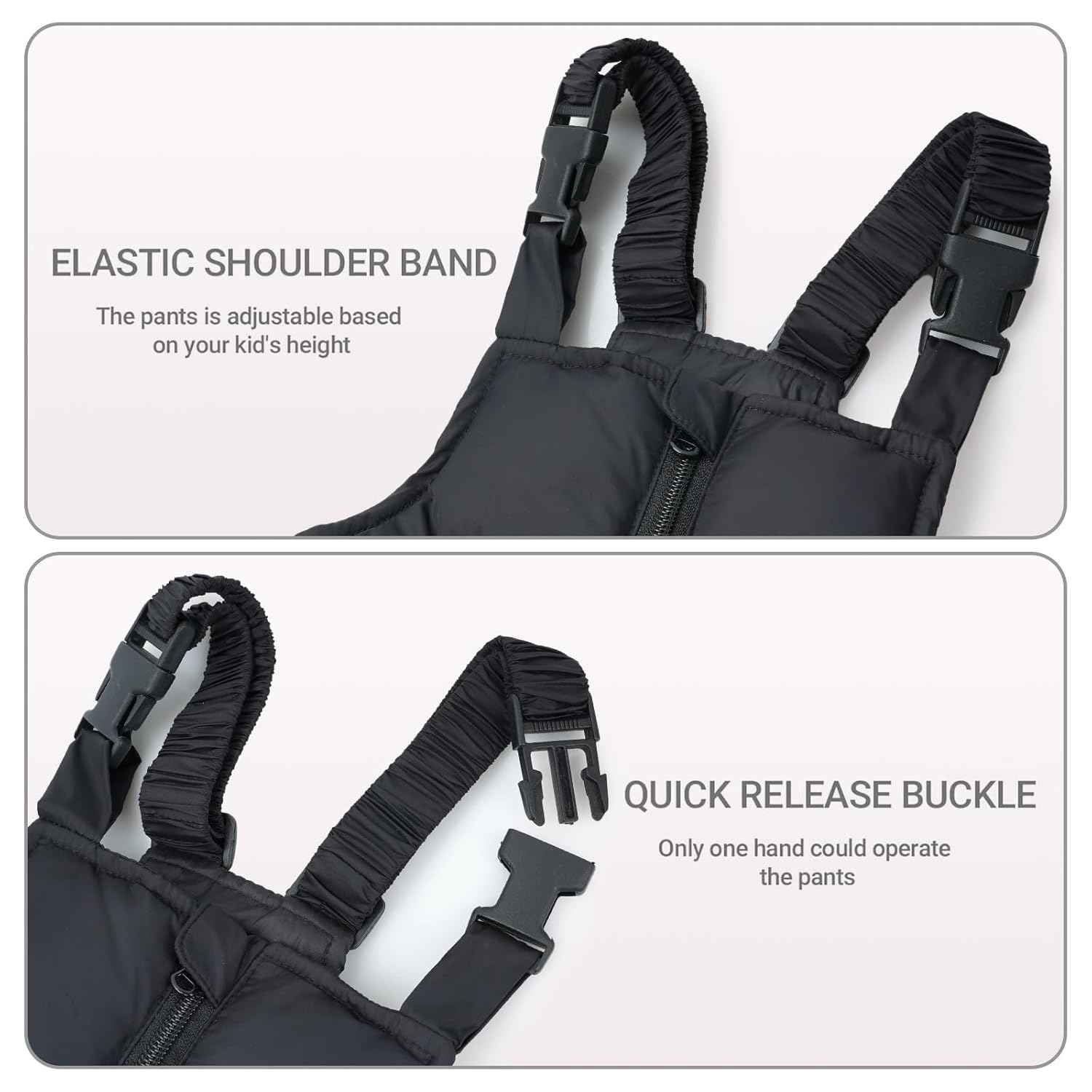 - Schneehosen --- Verstellbare Schultergurte mit Schnellverschlüssen, durchgehender Reißverschluss vorne, elastische Taillen- und Beinöffnungen.