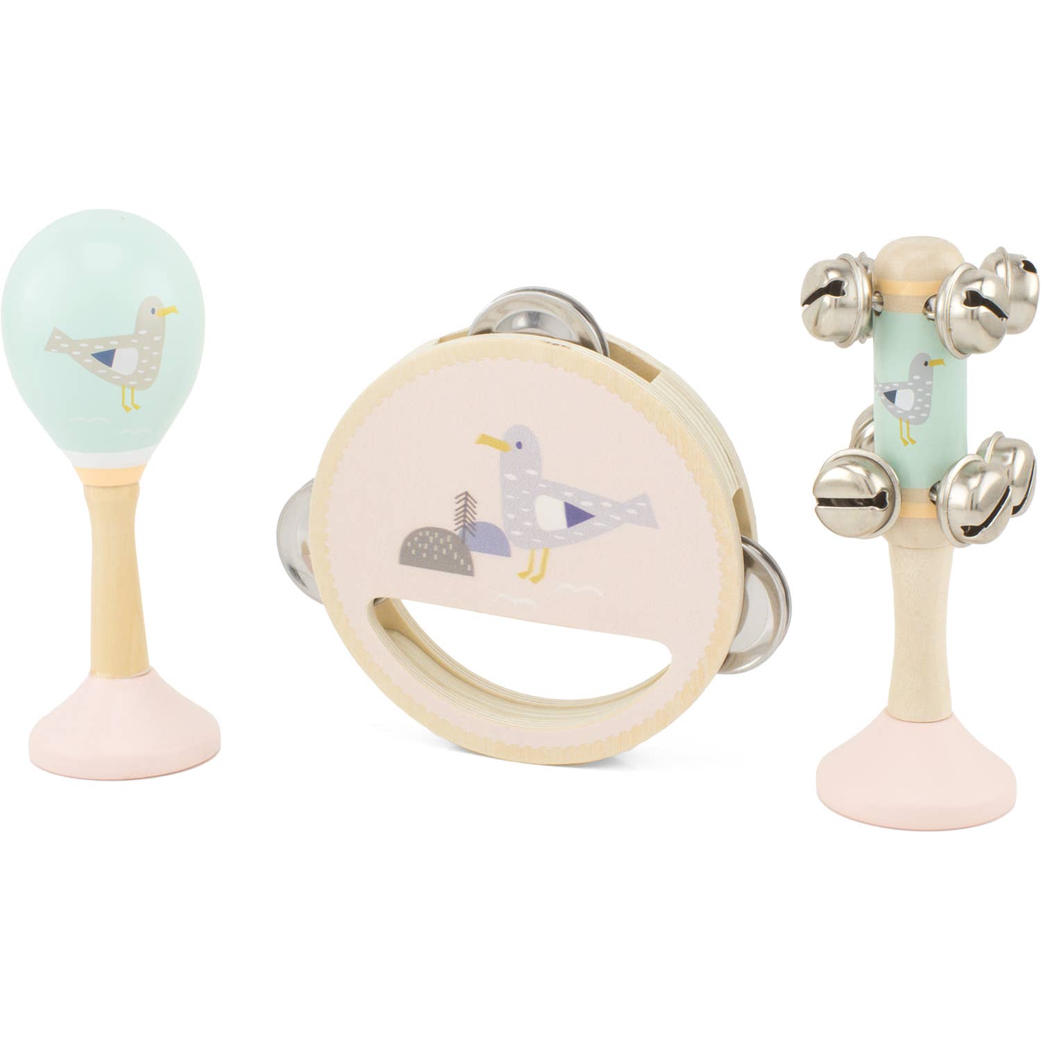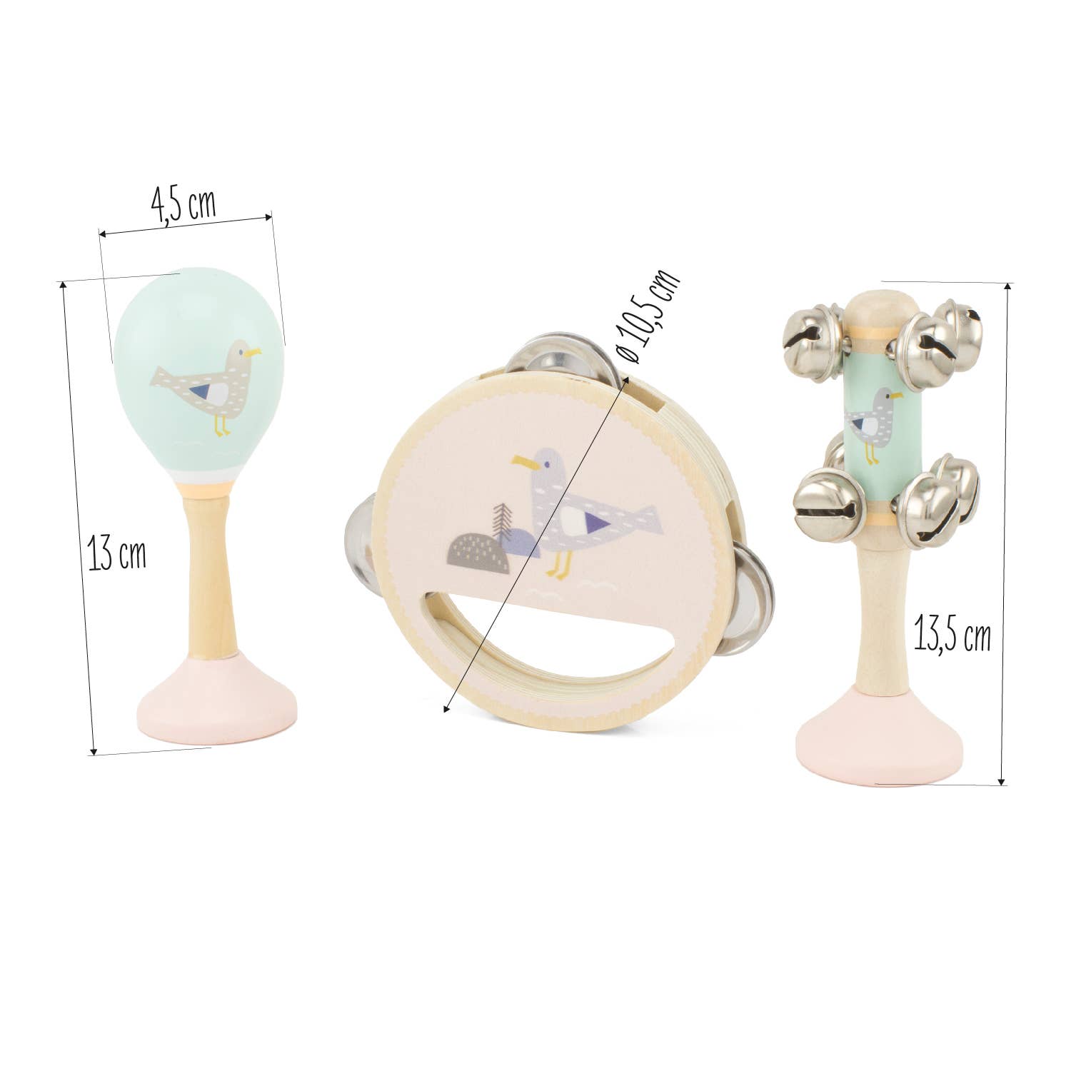 Lassen Sie Ihre Kleinen Musik entdecken mit unserem Holzmusikset mit drei Instrumenten: einem Maraca, einem Tamburin und einer Rassel mit acht Metallglocken. Das Tamburin ist komplett aus Holz gefertigt und verfügt über einen ergonomischen Griff und drei Becken für lustige Soundeffekte. Dieses Set ist für Kinder ab 18 Monaten geeignet und eignet sich perfekt, um die musikalische Kreativität zu fördern und gleichzeitig die Koordination und Feinmotorik zu stimulieren. Hergestellt aus hochwertigen und langlebigen Materialien, ist dieses Set ein ideales Geschenk für aufstrebende junge Musiker.
